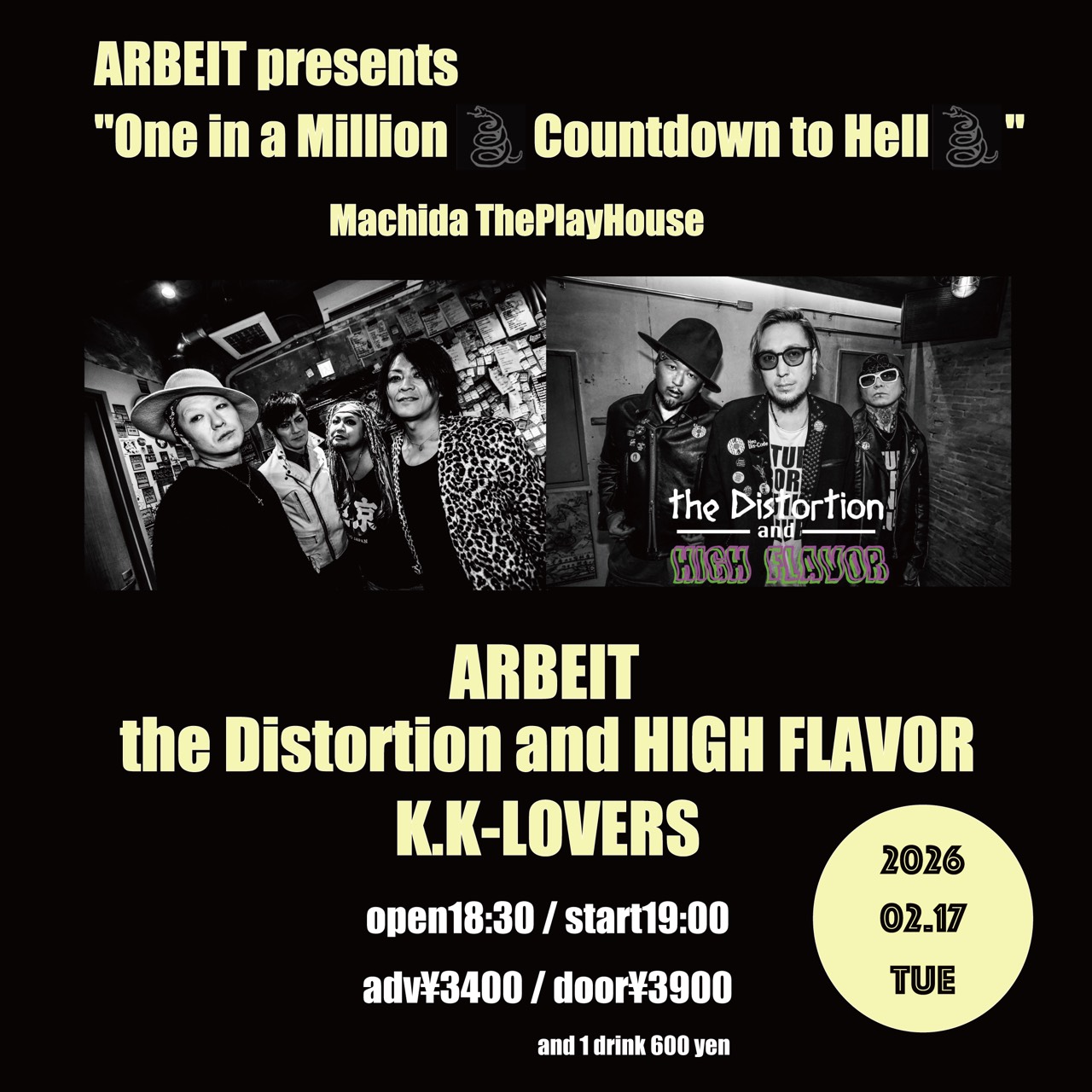 【ARBEIT presents『One in a Million Countdown to Hell』】 【日程】 2026年2月17日(火) OPEN 18:30 / START 19:00 【会場】 町田 The Play House 東京都町田市中町1-18-15 クローヴビル1F 【出演】 ARBEIT / the Distortion and HIGH FLAVOR / K.K LOVERS(Dr.HYDE/Gu.otoya/Gu.KAT/Ba.DI/vo→Guest!!) 【チケット】 前売 ¥3,400- / 当日 ¥3,900- (D別) 【お問い合わせ】 町田 The Play House 042-851-8311