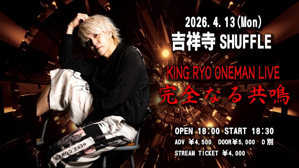 【 KING RYO ONEMAN LIVE〝完全なる共鳴〟】 【日程】 2026年4月13日(月) OPEN 18:00 / START 18:30 【会場】 吉祥寺SHUFFLE 東京都武蔵野市吉祥寺南町2丁目6-10 フジパームビルB1F 【出演】 KING RYO 【入場チケット】 ■Aチケット【事前振込 / 紙チケットあり / 整番あり】 KING WEB予約:kingryo.com/ticket-reserve ライブ番号「758」 事前エントリー:即時~3月10日23:59 振込期間:即時~3月10日23:59 入金確認メール:3月12日23:59までに返信します 早番争奪戦:3月13日22:00-22:05 整理番号付き予約完了メール送付:3月16日予定 ※振込時にお名前+ライブ番号を記入してください。 (例)あいうえお758 ※合算振込不可 ※詳細はHP参照 (kingryo.com/ticket-reserve)ページ下部に記載 ■Bチケット【当日払 / 紙チケットなし / 整番あり】 受付開始:即時~公演当日9:00(AM9:00) TIGET https://tiget.net/events/469598 ※名前欄は、本名フルネーム必須 ■当日券 【配信チケット】 配信チケットはこちらから 【入場順】 A→B→当日券 ※前売りで予定枚数を超えた場合は、当日券はありません。 【注意事項】 2023年3月13日よりマスク着用が個人の判断となりますが、吉祥寺SHUFFLEではマスク着用をお願い致します。 当分の間、出演アーティスト・お客様共に検温を行いますのでご理解とご協力お願い致します。 【お問い合わせ】 吉祥寺SHUFFLE 0422-42-2223