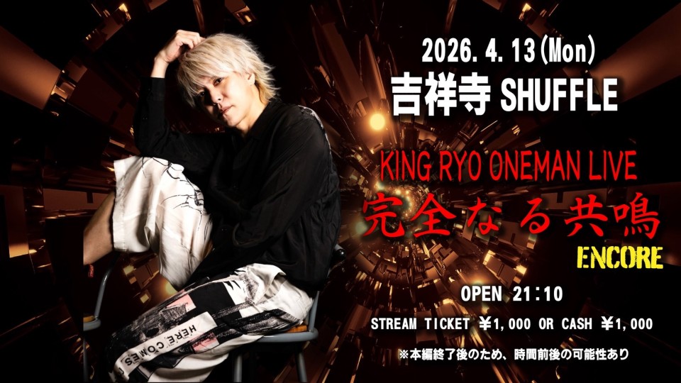 【 KING RYO ONEMAN LIVE〝完全なる共鳴 ENCORE〟】 【日程】 2026年4月13日(月) START 21:10 ※本編終了後のため、開始時間が前後する可能性があります。 【会場】 吉祥寺SHUFFLE 東京都武蔵野市吉祥寺南町2丁目6-10 フジパームビルB1F 【出演】 KING RYO 【チケット】 配信チケット¥1,000 or 現金払い¥1,000 配信チケットはこちらから 【入場方法】 あらかじめツイキャス配信用のチケットをご購入ください。 ライブハウス入場時、受付にて配信チケット購入済みの確認をさせていただき、別途ドリンク代のお支払いで入場可能となります。 【注意事項】 2023年3月13日よりマスク着用が個人の判断となりますが、吉祥寺SHUFFLEではマスク着用をお願い致します。 当分の間、出演アーティスト・お客様共に検温を行いますのでご理解とご協力お願い致します。 【お問い合わせ】 吉祥寺SHUFFLE 0422-42-2223