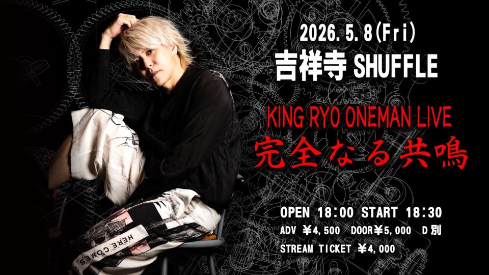 【 KING RYO ONEMAN LIVE〝完全なる共鳴〟】 【日程】 2026年5月8日(金) OPEN 18:00 / START 18:30 【会場】 吉祥寺SHUFFLE 東京都武蔵野市吉祥寺南町2丁目6-10 フジパームビルB1F 【出演】 KING RYO 【チケット料金】 入場チケット adv \4,500 / door¥5,000 D代別 配信チケット ¥4,000 【入場チケット】 ■Aチケット【事前振込 / 紙チケットあり / 整番あり】 KING WEB予約:kingryo.com/ticket-reserve ライブ番号「254」 事前エントリー:即時~4月6日23:59 振込期間:即時~4月6日23:59 入金確認メール:4月8日23:59までに返信します 早番争奪戦:4月9日22:00-22:05 整理番号付き予約完了メール送付:4月12日予定 ※振込時にお名前+ライブ番号を記入してください (例)あいうえお254 ※合算振込不可 ※詳細はHP参照 (kingryo.com/ticket-reserve)ページ下部に記載 ■Bチケット【当日払 / 紙チケットなし / 整番あり】 受付開始:即時~公演当日9:00(AM9:00) TIGET https://tiget.net/events/479013 ※名前欄は、本名フルネーム必須 / 偽名・交換・譲渡・無断キャンセル不可 ■当日券 【配信チケット】 配信チケットはこちらから 【入場順】 A→B→当日券 ※前売りで予定枚数を超えた場合は、当日券はありません。 【注意事項】 2023年3月13日よりマスク着用が個人の判断となりますが、吉祥寺SHUFFLEではマスク着用をお願い致します。 当分の間、出演アーティスト・お客様共に検温を行いますのでご理解とご協力お願い致します。 【お問い合わせ】 吉祥寺SHUFFLE 0422-42-2223