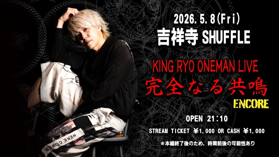 【 KING RYO ONEMAN LIVE〝完全なる共鳴 ENCORE〟】 【日程】 2026年5月8日(金) START 21:10 ※本編終了後のため、開始時間が前後する可能性があります。 【会場】 吉祥寺SHUFFLE 東京都武蔵野市吉祥寺南町2丁目6-10 フジパームビルB1F 【出演】 KING RYO 【チケット】 配信チケット¥1,000 or 現金払い¥1,000 配信チケットはこちらから 【入場方法】 あらかじめツイキャス配信用のチケットをご購入ください。 ライブハウス入場時、受付にて配信チケット購入済みの確認をさせていただき、別途ドリンク代のお支払いで入場可能となります。 【注意事項】 2023年3月13日よりマスク着用が個人の判断となりますが、吉祥寺SHUFFLEではマスク着用をお願い致します。 当分の間、出演アーティスト・お客様共に検温を行いますのでご理解とご協力お願い致します。 【お問い合わせ】 吉祥寺SHUFFLE 0422-42-2223